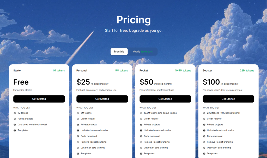 Starter Plan (Free): The free plan includes 1 million tokens to test the platform. This gives you enough capacity to build a few features, import a couple of Figma screens, and understand Rocket’s workflow. It’s genuinely useful for exploration, not just a marketing gimmick.