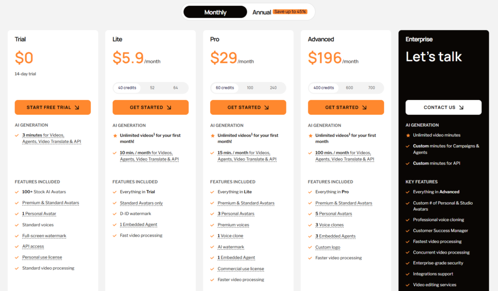 Budget matters too. D-ID’s entry point is lower, but HeyGen’s Creator plan at $29/month offers more features for solo creators. At the enterprise level, both offer custom pricing, so you’ll need to talk to sales either way.